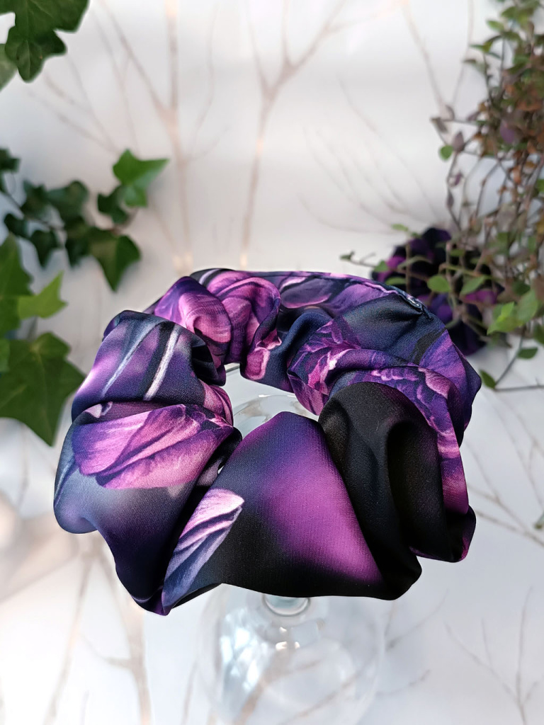 Střední scrunchie gumička - Tajemné tulipány Saténová